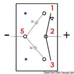 12/24 V switch | No toggle | ON1 - OFF - ON1+2 | ON1 = circuit 1 ON1+2 = circuit 1+2 Navigation lights on hulls up to 12 m: ON1 = white 360° ON1+2 = white 360°+ red/green 112°.5 | 4 |