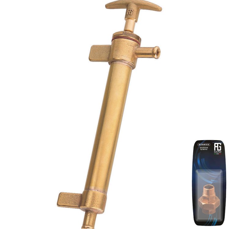 Guidi polished brass sump pump. Heavy duty brass barrel with cast ends and tee handle. Can be dismantled for cleaning and service. Brass piston with O ring.