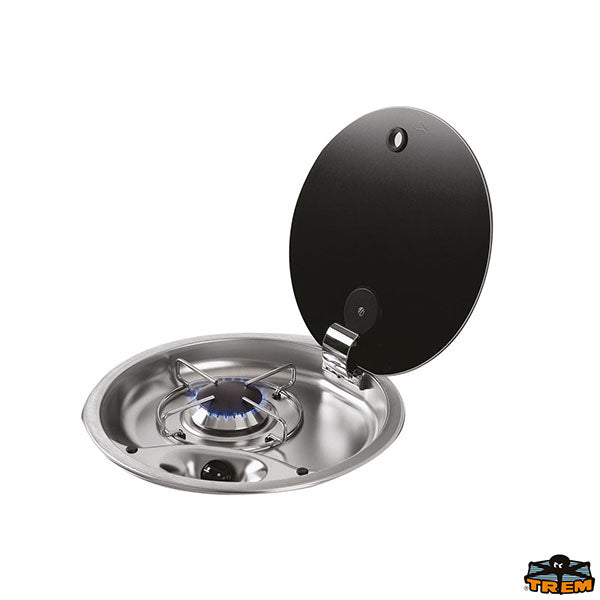Made of polished stainless steel. powered by LPG 28-30 Bar, tempered glass lid. Ignition with piezo.