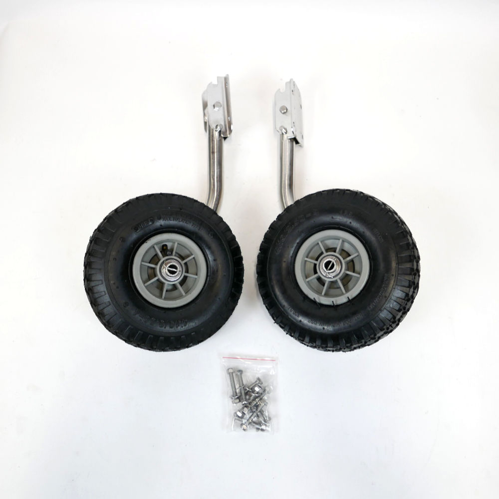 A set of quality stainless steel launching wheels suitable for fitting onto rigid transom of Inflatable boats, RIB. Very convenient when transferring boat to launching site, specially with an outboard attached and other equipment in the boat.