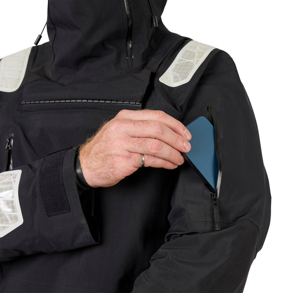 Using fabric technology originally formulated for professional and military use, this dry top is our most rugged, lightweight, and waterproof shell. This versatile piece can be worn across all sailing climates thanks to its innovative removable hood via Magic Chain Link with integrated face coverage. A neoprene inner skirt and the latex wrist and neck seals provide maximum protection against water ingress. Photoluminescent reflective patches on the shoulders increase your visibility and safety in low-light situations, and the 500D Cordura® reinforced elbows and back hem are abrasion-resistant. Chest, sleeve, and kangaroo pockets help you store, organize, and easily access essential gear. Never skip a beat in this dry top made for the harshest environments. The entire EP 6.5 Ocean line is available in an extended range from XS to 2XL, making it the preferred choice for more users, including women. Note the size chart refers to the men's chart; please measure yourself to ensure an optimal fit.