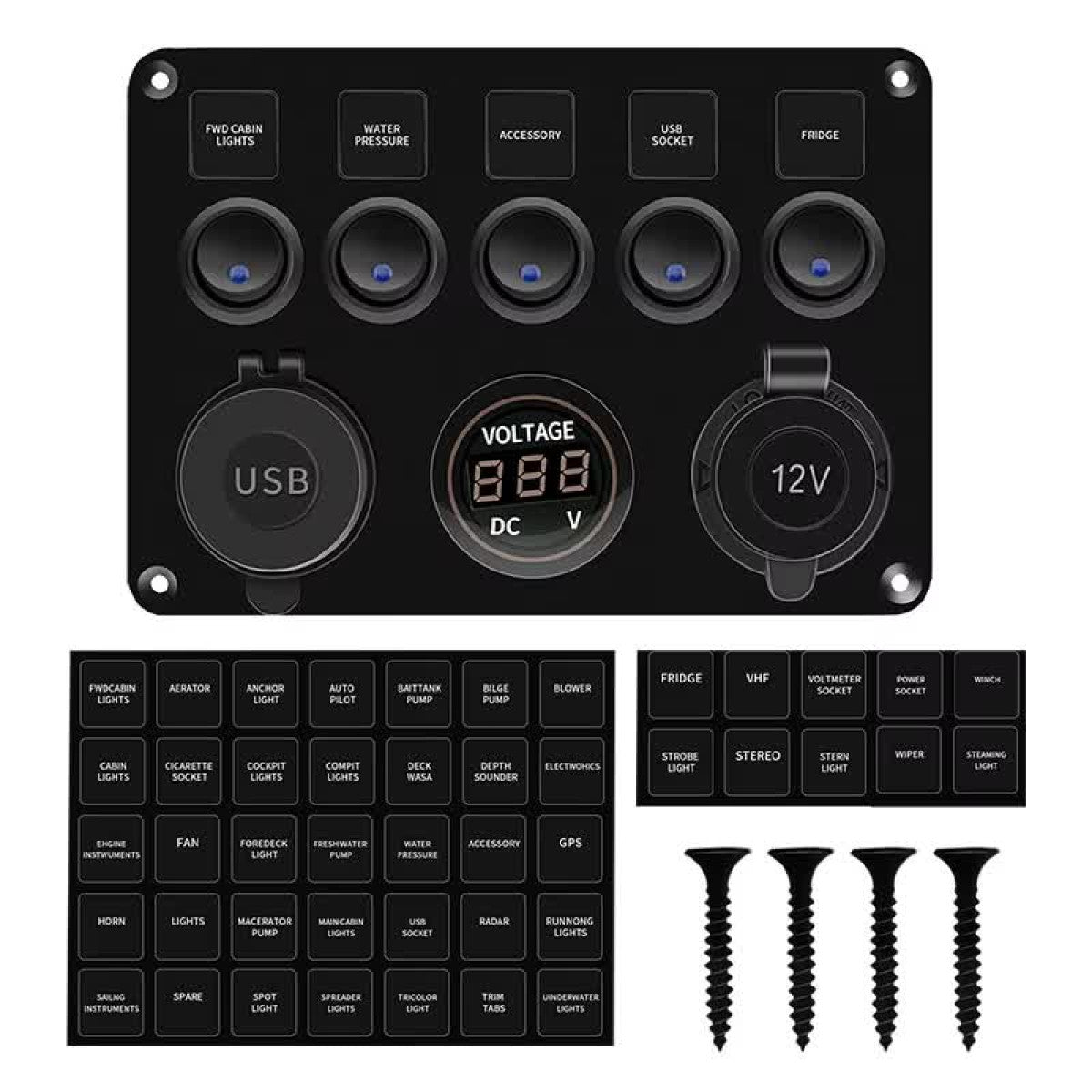- Multifunctional design featuring 6 toggle switches, dual USB charging ports, a cigarette lighter socket, and an LED voltmeter.
