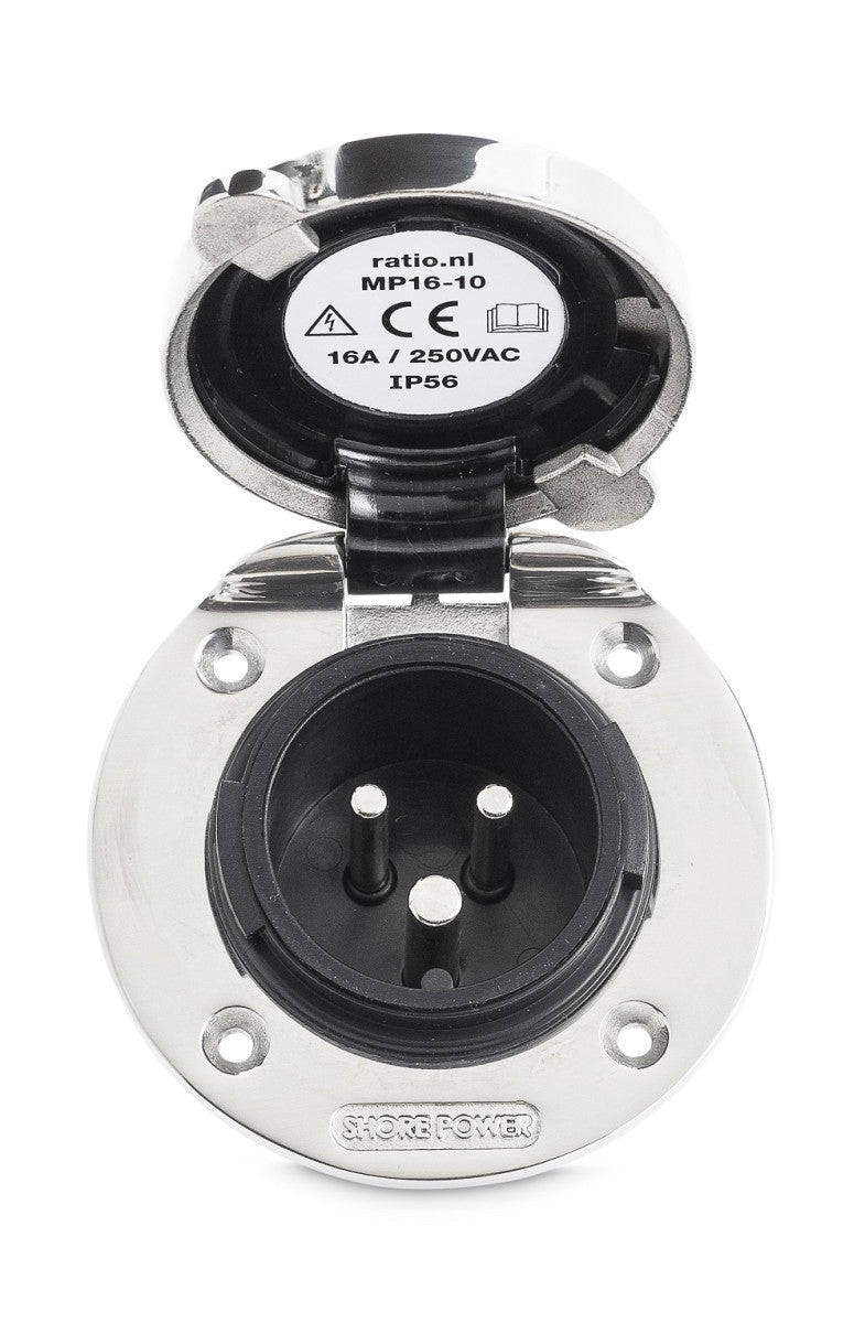 Ratio Stainless steel shorepower inlet. 2P+E. 240v 16 A - MP16-10. IP Rating - IP56 when closed or plug is connected. (Cut out 55mm - OD 88mm).