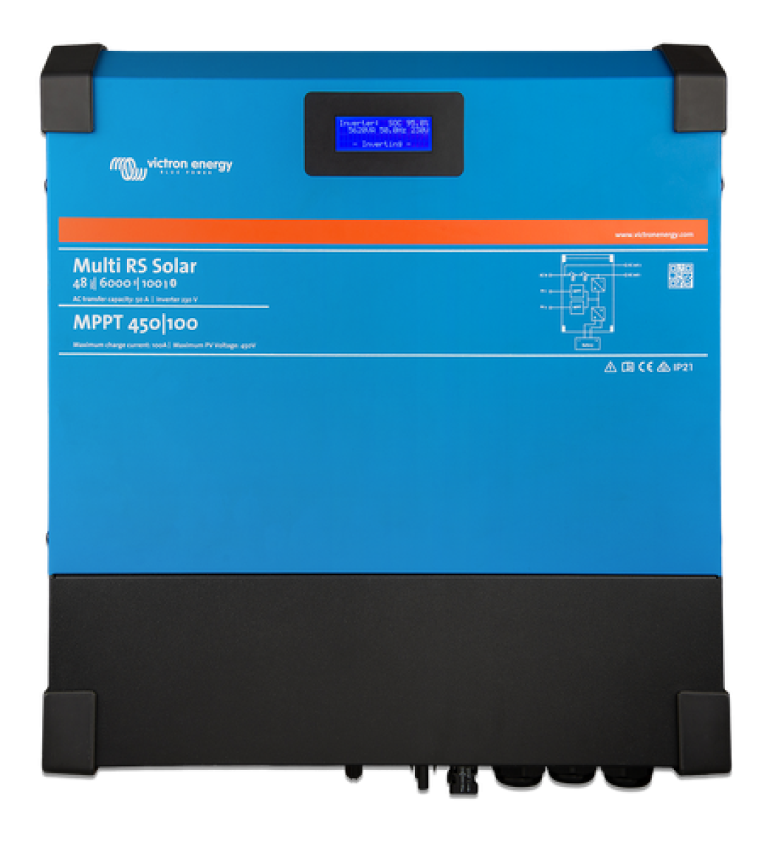 The Multi RS Solar 48/6000 is a 48V 6kVA Inverter/Charger with two independent 3kWp PV 450V MPPT tracker inputs for 6kWp PV total.