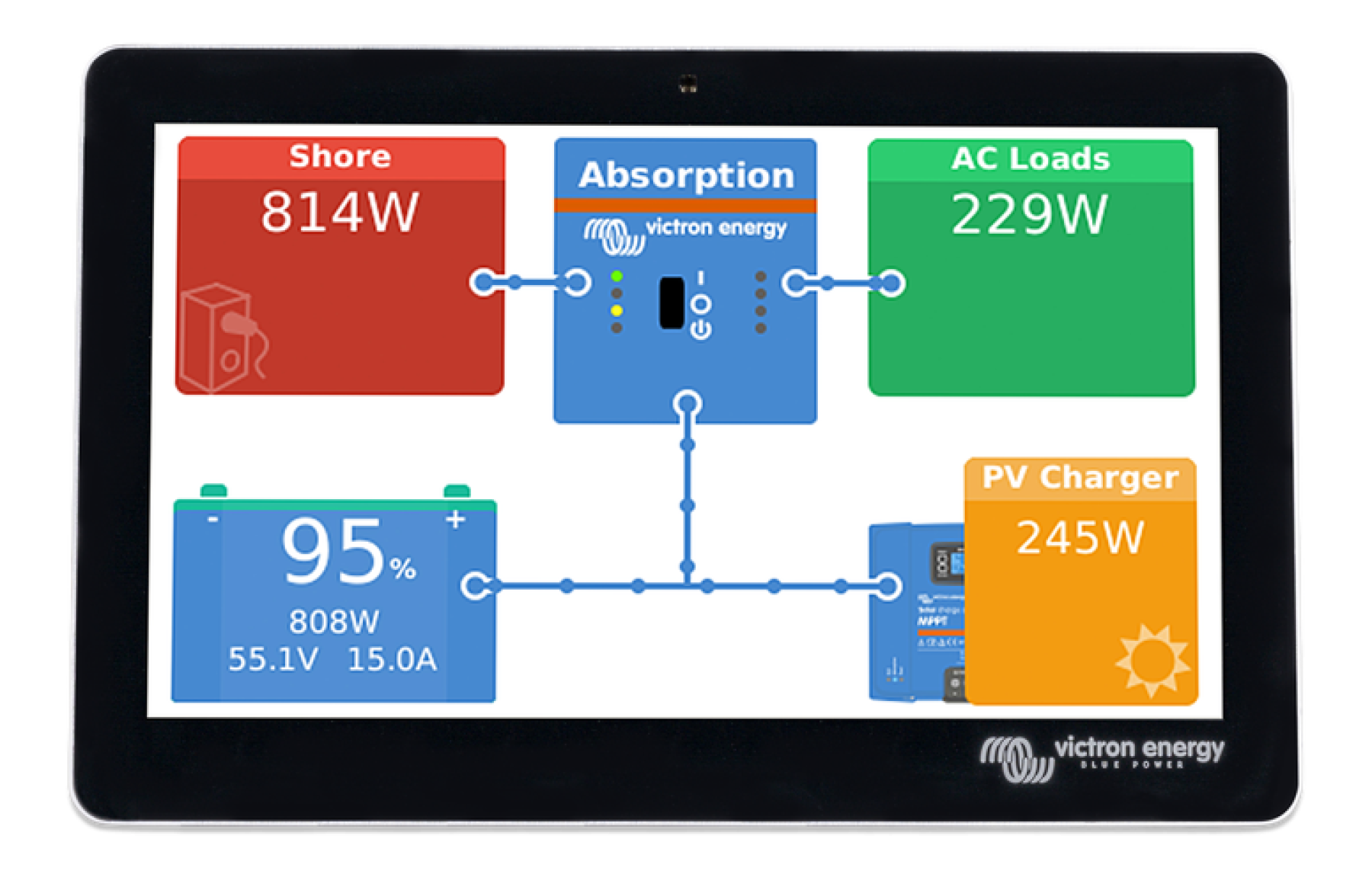 The GX Touch is a companion to the Cerbo GX. This communication-centre allows you to always have perfect control over your system from wherever you are and maximises its performance. Simply connect through our Victron Remote Management (VRM) portal, or access directly, using the GX Touch, an MFD or our VictronConnect App thanks to its built-in WiFi Access Point. This latest addition to the GX-range combines all the best of connectivity, redefining smart power solutions in every way.