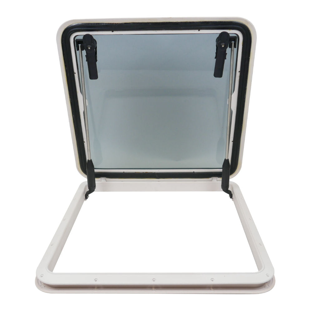 A Grey Tinted Glass Opening Hatch with a White Grain Finish, perfect for Boats and Caravans. Low Profile.