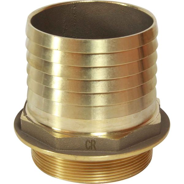 Maestrini straight hose tail fitting made from dezincification resistant brass (DZR), also known as CR brass which stands for corrosion resistant. This material is a brass alloy which prevents corrosion, caused by the loss of zinc in the fitting, making it suitable for exposure to sea water. This hose tail connects a 4" BSP threaded pipe to a 100mm hose connection.