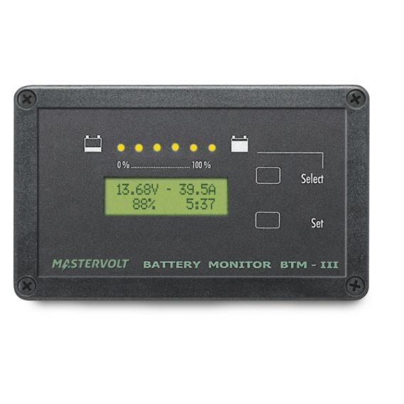 The Masterlink BTM-III battery monitor provides an accurate indication of the current, amperage, remaining time and remaining capacity of battery bank 1, and the current and estimated capacity of battery banks 2 and 3. The built-in microprocessor calculates the remaining capacity and stores historic data.