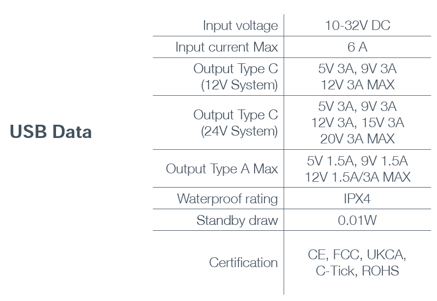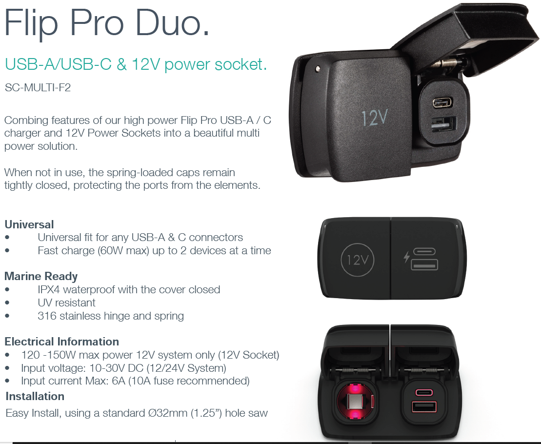Combing the features of Scanstrut's high-power Flip Pro USB-A / C charger and 12V Power Sockets into a beautiful multi power solution. When not in use, the spring-loaded caps remain tightly closed, protecting the ports from the elements. Featuring a super-compact footprint, Flip Pro Duo is constructed from premium, marine-grade materials and is IPX4 waterproof, making it completely washdown-ready.