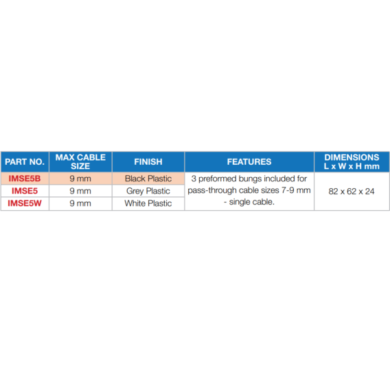 Preformed bungs included for pass-through suitable for cable sizes 7-9mm