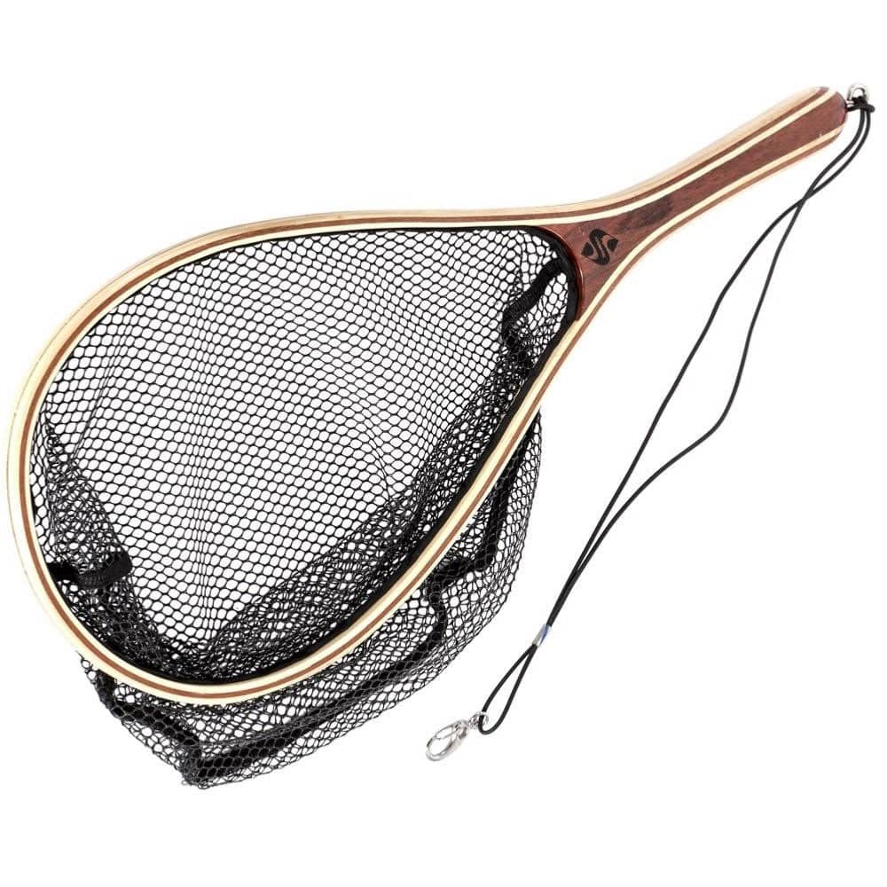 Snowbee\'s range of Hand Trout nets are made from laminated Red Meranti wood for strength and light weight. Available in two frame sizes to cover all requirements from small wild brown trout in moorland streams up to larger stocked brownies and grayling in the larger rivers. Both models are fitted with a fine 6mm rubber-coated mesh to avoid scale damage for catch and release and also avoids unpleasant odor and hooks catching in the mesh. Fitted with a handle eye to which an elasticated lanyard and clip is attached. Being a natural material colour may vary from the images