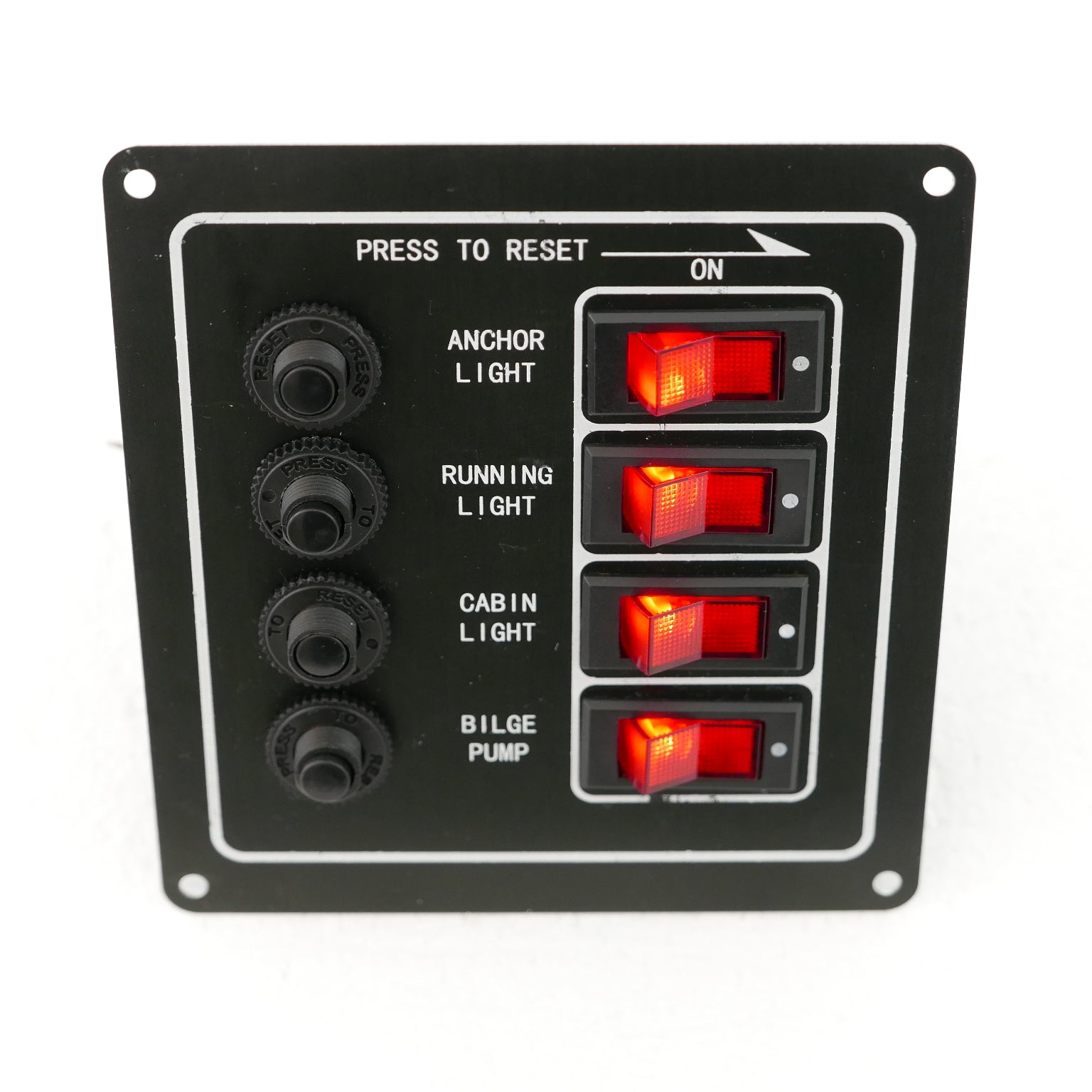 4 Gang Switch Panel. Rocker type switch, push-to-reset fuse and white lettering.