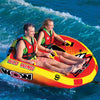 The Wild Wing series has a Hi-performance U-shaped winged body design with curved bottom slides much more easily over the wake than the standard flat bottom. This means a more exciting ride, as well as less drag on your boat. The Wild Wing comes with front and back towing so you can ride sitting down going forward or connect it to the back tow point for chariot . The new HI-Performance Secure slotted deck seating with slot dividers keeps the riders from sliding and bumping into each other on the more extreme rides. So get out on the water with the WOW Wild Wing 2.